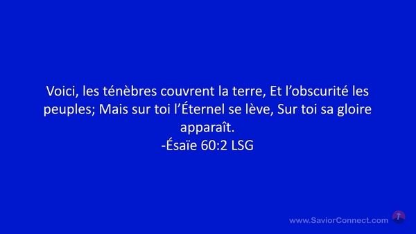Voici, les ténèbres couvrent la terre, Et l'obscurité les peuples; Mais sur toi l'Éternel se lève, Sur toi sa gloire apparaît. -Ésaïe 60:2 LSG