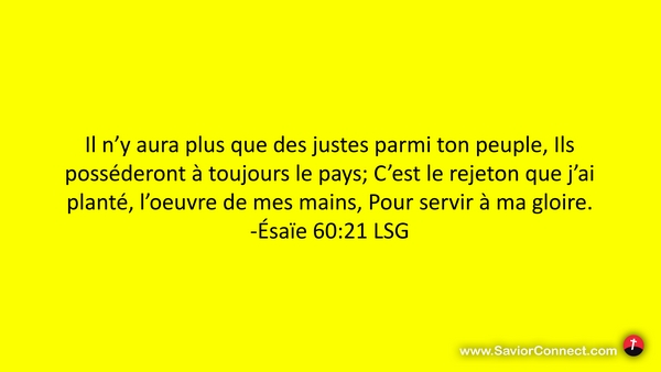 Il n'y aura plus que des justes parmi ton peuple, Ils posséderont à toujours le pays; C'est le rejeton que j'ai planté, l'oeuvre de mes mains, Pour servir à ma gloire. -Ésaïe 60:21 LSG