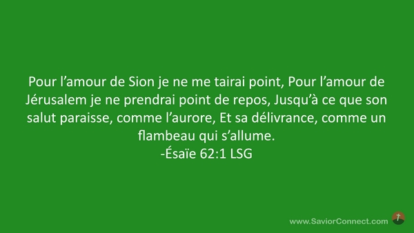 Pour l'amour de Sion je ne me tairai point, Pour l'amour de Jérusalem je ne prendrai point de repos, Jusqu'à ce que son salut paraisse, comme l'aurore, Et sa délivrance, comme un flambeau qui s'allume. -Ésaïe 62:1 LSG