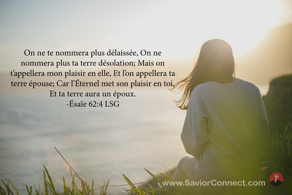 On ne te nommera plus délaissée, On ne nommera plus ta terre désolation; Mais on t'appellera mon plaisir en elle, Et l'on appellera ta terre épouse; Car l'Éternel met son plaisir en toi, Et ta terre aura un époux. -Ésaïe 62:4 LSG