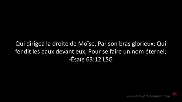 Qui dirigea la droite de Moïse, Par son bras glorieux; Qui fendit les eaux devant eux, Pour se faire un nom éternel; -Ésaïe 63:12 LSG