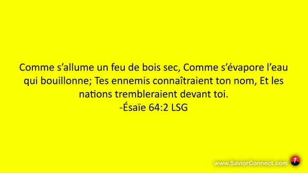 Comme s'allume un feu de bois sec, Comme s'évapore l'eau qui bouillonne; Tes ennemis connaîtraient ton nom, Et les nations trembleraient devant toi. -Ésaïe 64:2 LSG