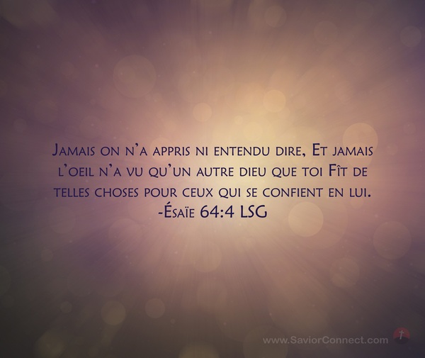 Jamais on n'a appris ni entendu dire, Et jamais l'oeil n'a vu qu'un autre dieu que toi Fît de telles choses pour ceux qui se confient en lui. -Ésaïe 64:4 LSG