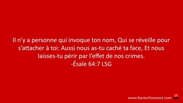 Il n'y a personne qui invoque ton nom, Qui se réveille pour s'attacher à toi: Aussi nous as-tu caché ta face, Et nous laisses-tu périr par l'effet de nos crimes. -Ésaïe 64:7 LSG