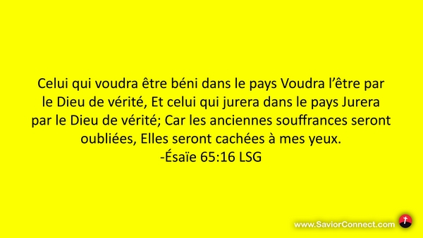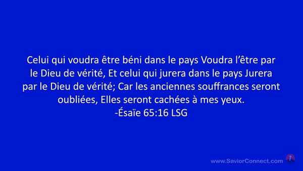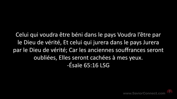 Celui qui voudra être béni dans le pays Voudra l'être par le Dieu de vérité, Et celui qui jurera dans le pays Jurera par le Dieu de vérité; Car les anciennes souffrances seront oubliées, Elles seront cachées à mes yeux. -Ésaïe 65:16 LSG