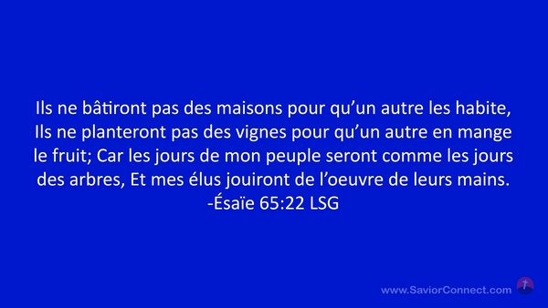 Ils ne bâtiront pas des maisons pour qu'un autre les habite, Ils ne planteront pas des vignes pour qu'un autre en mange le fruit; Car les jours de mon peuple seront comme les jours des arbres, Et mes élus jouiront de l'oeuvre de leurs mains. -Ésaïe 65:22 LSG