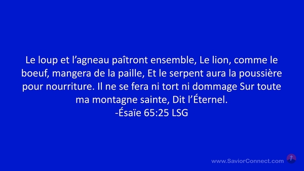Le loup et l'agneau paîtront ensemble, Le lion, comme le boeuf, mangera de la paille, Et le serpent aura la poussière pour nourriture. Il ne se fera ni tort ni dommage Sur toute ma montagne sainte, Dit l'Éternel. -Ésaïe 65:25 LSG