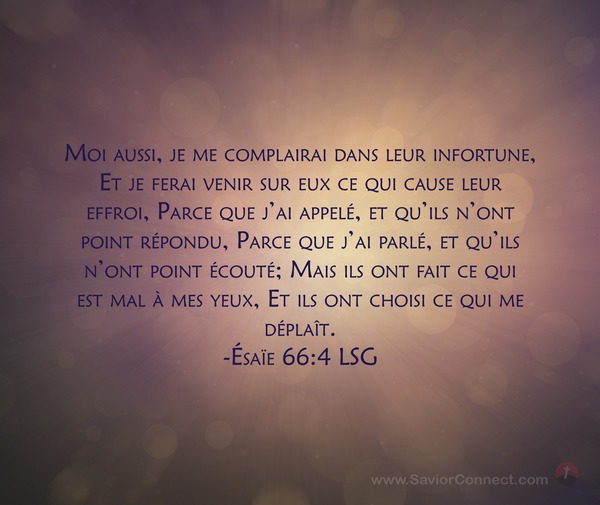 Moi aussi, je me complairai dans leur infortune, Et je ferai venir sur eux ce qui cause leur effroi, Parce que j'ai appelé, et qu'ils n'ont point répondu, Parce que j'ai parlé, et qu'ils n'ont point écouté; Mais ils ont fait ce qui est mal à mes yeux, Et ils ont choisi ce qui me déplaît. -Ésaïe 66:4 LSG