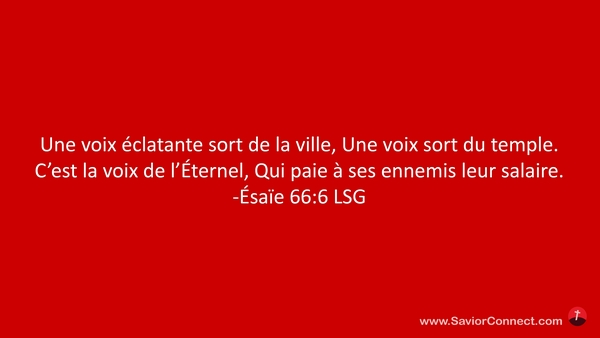Une voix éclatante sort de la ville, Une voix sort du temple. C'est la voix de l'Éternel, Qui paie à ses ennemis leur salaire. -Ésaïe 66:6 LSG