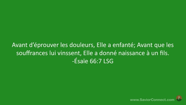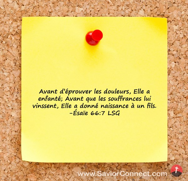 Avant d'éprouver les douleurs, Elle a enfanté; Avant que les souffrances lui vinssent, Elle a donné naissance à un fils. -Ésaïe 66:7 LSG