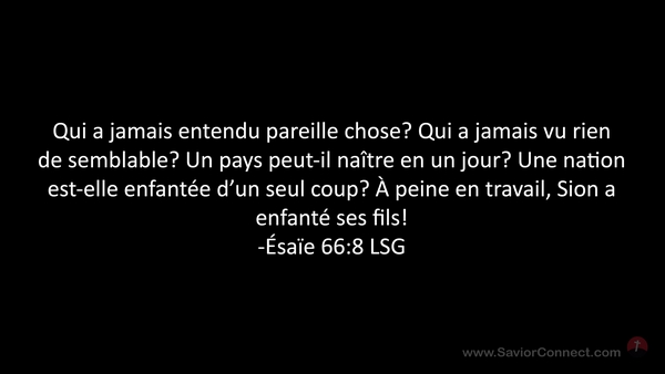 Qui a jamais entendu pareille chose? Qui a jamais vu rien de semblable? Un pays peut-il naître en un jour? Une nation est-elle enfantée d'un seul coup? À peine en travail, Sion a enfanté ses fils! -Ésaïe 66:8 LSG