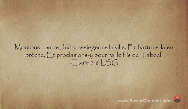 Montons contre Juda, assiégeons la ville, Et battons-la en brèche, Et proclamons-y pour roi le fils de Tabeel. -Ésaïe 7:6 LSG
