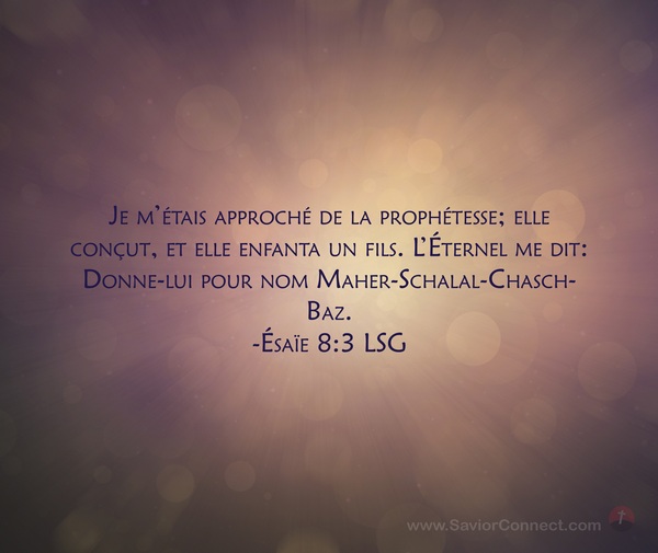 Je m'étais approché de la prophétesse; elle conçut, et elle enfanta un fils. L'Éternel me dit: Donne-lui pour nom Maher-Schalal-Chasch-Baz. -Ésaïe 8:3 LSG