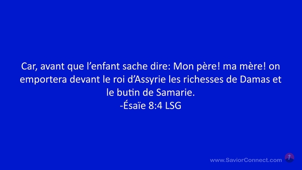 Car, avant que l'enfant sache dire: Mon père! ma mère! on emportera devant le roi d'Assyrie les richesses de Damas et le butin de Samarie. -Ésaïe 8:4 LSG