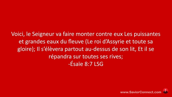 Voici, le Seigneur va faire monter contre eux Les puissantes et grandes eaux du fleuve (Le roi d'Assyrie et toute sa gloire); Il s'élèvera partout au-dessus de son lit, Et il se répandra sur toutes ses rives; -Ésaïe 8:7 LSG