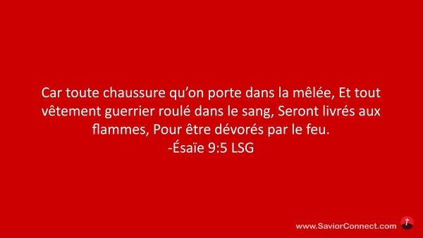 Car toute chaussure qu'on porte dans la mêlée, Et tout vêtement guerrier roulé dans le sang, Seront livrés aux flammes, Pour être dévorés par le feu. -Ésaïe 9:5 LSG