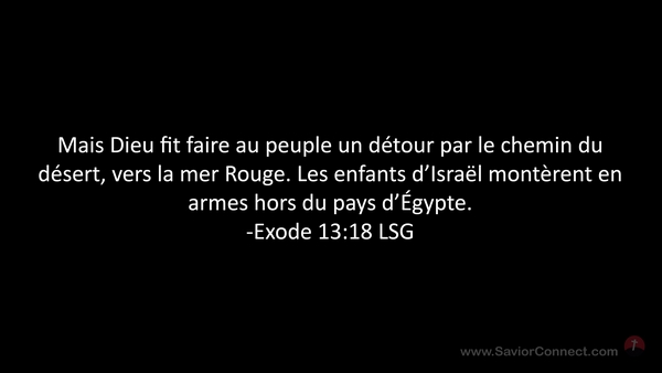 Mais Dieu fit faire au peuple un détour par le chemin du désert, vers la mer Rouge. Les enfants d'Israël montèrent en armes hors du pays d'Égypte. -Exode 13:18 LSG
