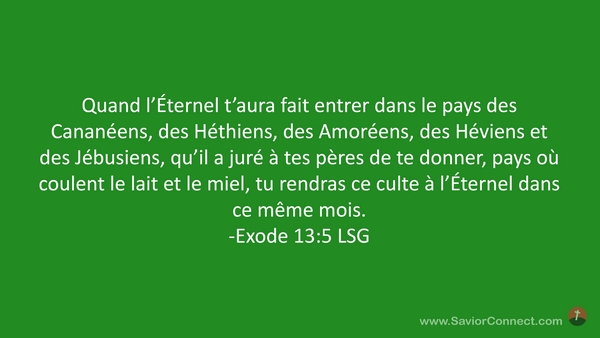 Quand l'Éternel t'aura fait entrer dans le pays des Cananéens, des Héthiens, des Amoréens, des Héviens et des Jébusiens, qu'il a juré à tes pères de te donner, pays où coulent le lait et le miel, tu rendras ce culte à l'Éternel dans ce même mois. -Exode 13:5 LSG