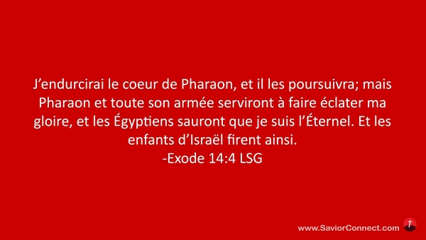 J'endurcirai le coeur de Pharaon, et il les poursuivra; mais Pharaon et toute son armée serviront à faire éclater ma gloire, et les Égyptiens sauront que je suis l'Éternel. Et les enfants d'Israël firent ainsi. -Exode 14:4 LSG