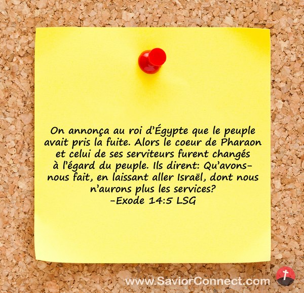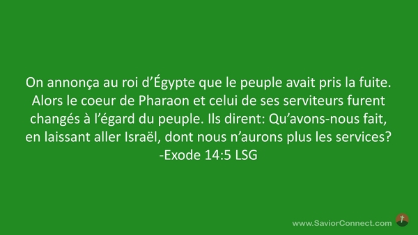 On annonça au roi d'Égypte que le peuple avait pris la fuite. Alors le coeur de Pharaon et celui de ses serviteurs furent changés à l'égard du peuple. Ils dirent: Qu'avons-nous fait, en laissant aller Israël, dont nous n'aurons plus les services? -Exode 14:5 LSG
