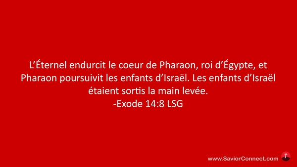 L'Éternel endurcit le coeur de Pharaon, roi d'Égypte, et Pharaon poursuivit les enfants d'Israël. Les enfants d'Israël étaient sortis la main levée. -Exode 14:8 LSG