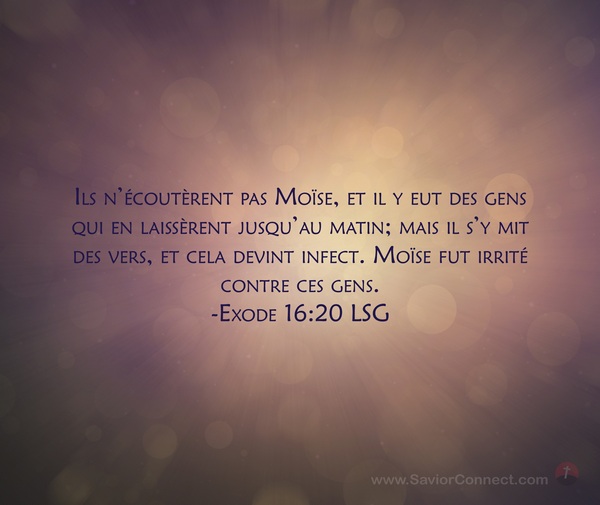 Ils n'écoutèrent pas Moïse, et il y eut des gens qui en laissèrent jusqu'au matin; mais il s'y mit des vers, et cela devint infect. Moïse fut irrité contre ces gens. -Exode 16:20 LSG