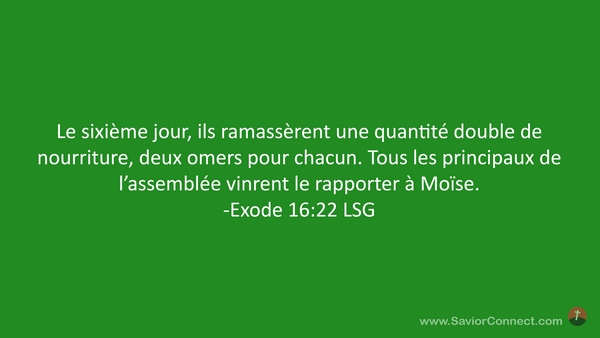 Le sixième jour, ils ramassèrent une quantité double de nourriture, deux omers pour chacun. Tous les principaux de l'assemblée vinrent le rapporter à Moïse. -Exode 16:22 LSG