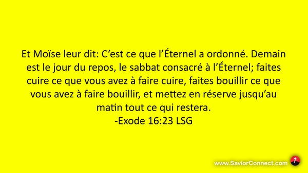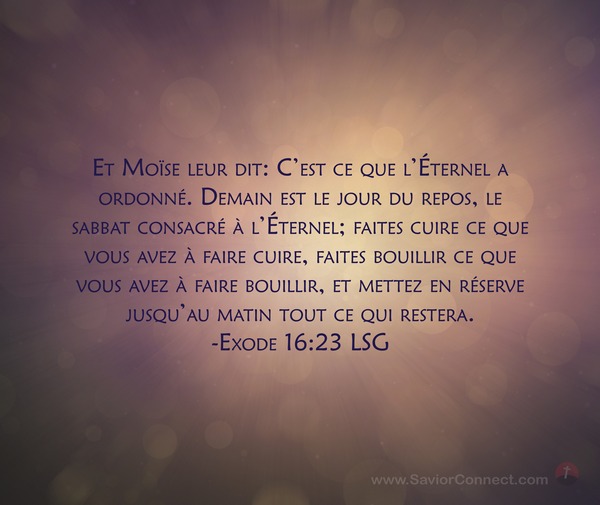 Et Moïse leur dit: C'est ce que l'Éternel a ordonné. Demain est le jour du repos, le sabbat consacré à l'Éternel; faites cuire ce que vous avez à faire cuire, faites bouillir ce que vous avez à faire bouillir, et mettez en réserve jusqu'au matin tout ce qui restera. -Exode 16:23 LSG