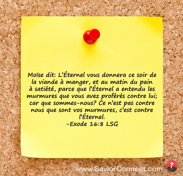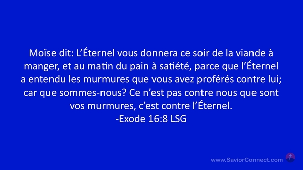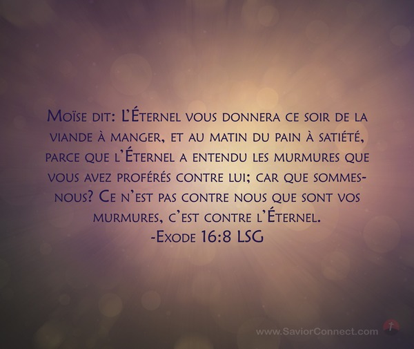 Moïse dit: L'Éternel vous donnera ce soir de la viande à manger, et au matin du pain à satiété, parce que l'Éternel a entendu les murmures que vous avez proférés contre lui; car que sommes-nous? Ce n'est pas contre nous que sont vos murmures, c'est contre l'Éternel. -Exode 16:8 LSG