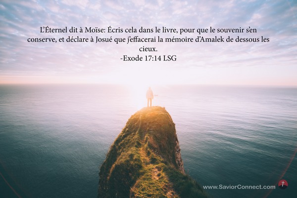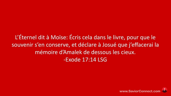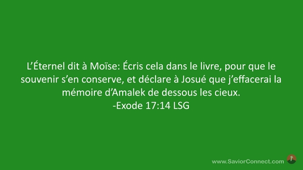 L'Éternel dit à Moïse: Écris cela dans le livre, pour que le souvenir s'en conserve, et déclare à Josué que j'effacerai la mémoire d'Amalek de dessous les cieux. -Exode 17:14 LSG