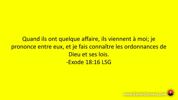 Quand ils ont quelque affaire, ils viennent à moi; je prononce entre eux, et je fais connaître les ordonnances de Dieu et ses lois. -Exode 18:16 LSG