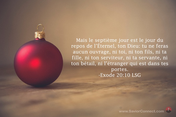 Mais le septième jour est le jour du repos de l'Éternel, ton Dieu: tu ne feras aucun ouvrage, ni toi, ni ton fils, ni ta fille, ni ton serviteur, ni ta servante, ni ton bétail, ni l'étranger qui est dans tes portes. -Exode 20:10 LSG