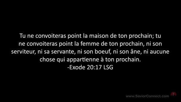 Tu ne convoiteras point la maison de ton prochain; tu ne convoiteras point la femme de ton prochain, ni son serviteur, ni sa servante, ni son boeuf, ni son âne, ni aucune chose qui appartienne à ton prochain. -Exode 20:17 LSG