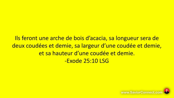Ils feront une arche de bois d'acacia, sa longueur sera de deux coudées et demie, sa largeur d'une coudée et demie, et sa hauteur d'une coudée et demie. -Exode 25:10 LSG