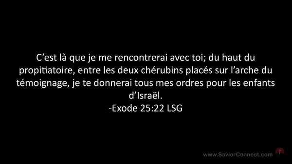 C'est là que je me rencontrerai avec toi; du haut du propitiatoire, entre les deux chérubins placés sur l'arche du témoignage, je te donnerai tous mes ordres pour les enfants d'Israël. -Exode 25:22 LSG