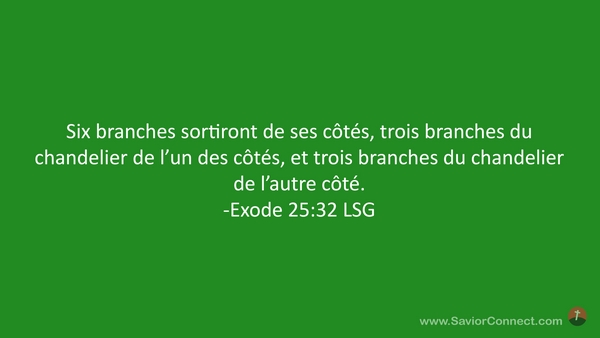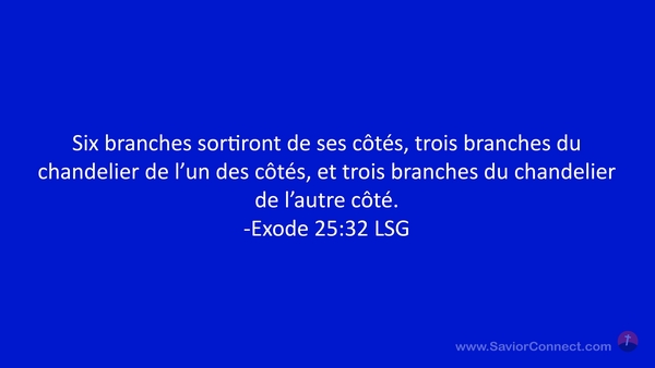 Six branches sortiront de ses côtés, trois branches du chandelier de l'un des côtés, et trois branches du chandelier de l'autre côté. -Exode 25:32 LSG