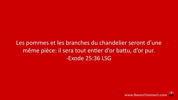 Les pommes et les branches du chandelier seront d'une même pièce: il sera tout entier d'or battu, d'or pur. -Exode 25:36 LSG