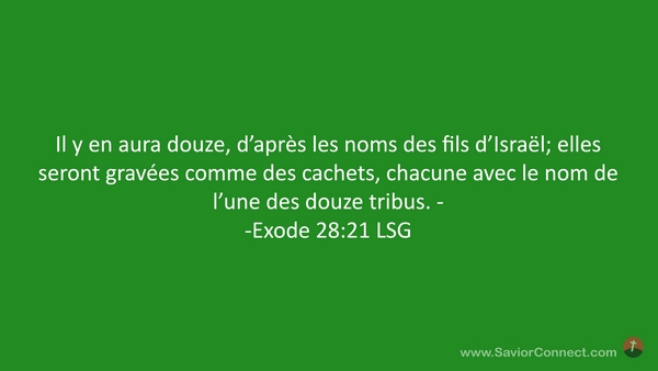 Il y en aura douze, d'après les noms des fils d'Israël; elles seront gravées comme des cachets, chacune avec le nom de l'une des douze tribus. - -Exode 28:21 LSG