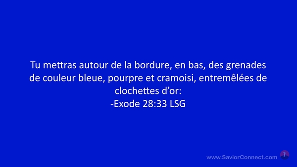 Tu mettras autour de la bordure, en bas, des grenades de couleur bleue, pourpre et cramoisi, entremêlées de clochettes d'or: -Exode 28:33 LSG
