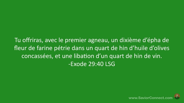 Tu offriras, avec le premier agneau, un dixième d'épha de fleur de farine pétrie dans un quart de hin d'huile d'olives concassées, et une libation d'un quart de hin de vin. -Exode 29:40 LSG