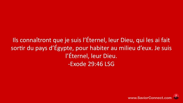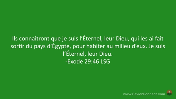 Ils connaîtront que je suis l'Éternel, leur Dieu, qui les ai fait sortir du pays d'Égypte, pour habiter au milieu d'eux. Je suis l'Éternel, leur Dieu. -Exode 29:46 LSG