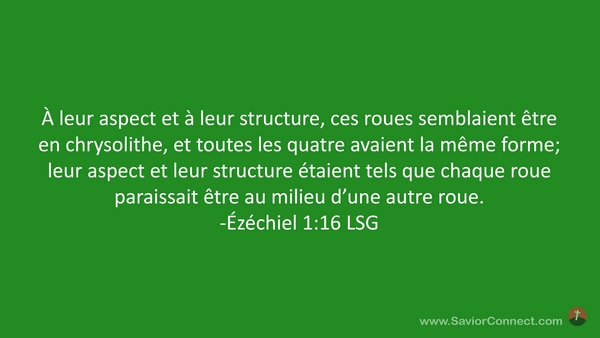À leur aspect et à leur structure, ces roues semblaient être en chrysolithe, et toutes les quatre avaient la même forme; leur aspect et leur structure étaient tels que chaque roue paraissait être au milieu d'une autre roue. -Ézéchiel 1:16 LSG