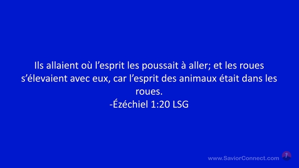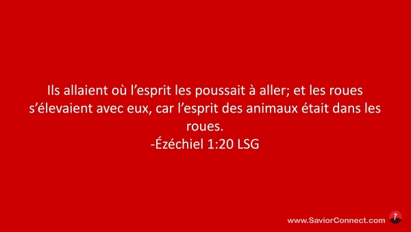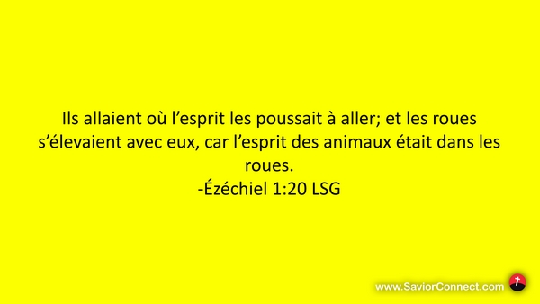 Ils allaient où l'esprit les poussait à aller; et les roues s'élevaient avec eux, car l'esprit des animaux était dans les roues. -Ézéchiel 1:20 LSG