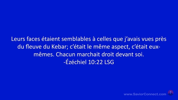 Leurs faces étaient semblables à celles que j'avais vues près du fleuve du Kebar; c'était le même aspect, c'était eux-mêmes. Chacun marchait droit devant soi. -Ézéchiel 10:22 LSG