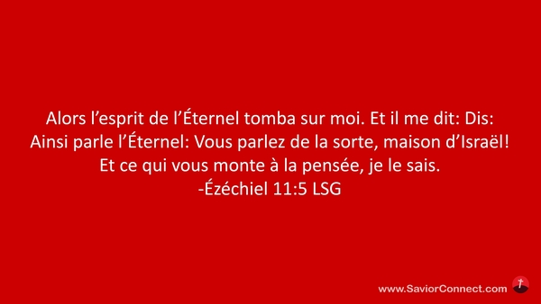 Alors l'esprit de l'Éternel tomba sur moi. Et il me dit: Dis: Ainsi parle l'Éternel: Vous parlez de la sorte, maison d'Israël! Et ce qui vous monte à la pensée, je le sais. -Ézéchiel 11:5 LSG