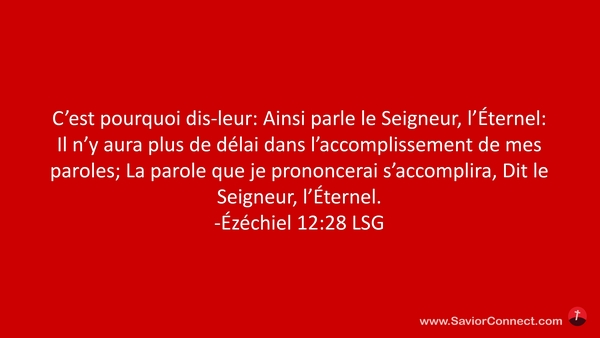 C'est pourquoi dis-leur: Ainsi parle le Seigneur, l'Éternel: Il n'y aura plus de délai dans l'accomplissement de mes paroles; La parole que je prononcerai s'accomplira, Dit le Seigneur, l'Éternel. -Ézéchiel 12:28 LSG