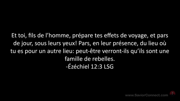 Et toi, fils de l'homme, prépare tes effets de voyage, et pars de jour, sous leurs yeux! Pars, en leur présence, du lieu où tu es pour un autre lieu: peut-être verront-ils qu'ils sont une famille de rebelles. -Ézéchiel 12:3 LSG