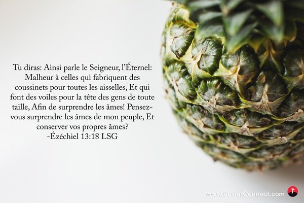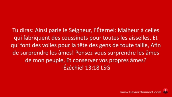 Tu diras: Ainsi parle le Seigneur, l'Éternel: Malheur à celles qui fabriquent des coussinets pour toutes les aisselles, Et qui font des voiles pour la tête des gens de toute taille, Afin de surprendre les âmes! Pensez-vous surprendre les âmes de mon peuple, Et conserver vos propres âmes? -Ézéchiel 13:18 LSG