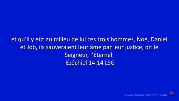 et qu'il y eût au milieu de lui ces trois hommes, Noé, Daniel et Job, ils sauveraient leur âme par leur justice, dit le Seigneur, l'Éternel. -Ézéchiel 14:14 LSG