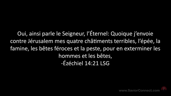 Oui, ainsi parle le Seigneur, l'Éternel: Quoique j'envoie contre Jérusalem mes quatre châtiments terribles, l'épée, la famine, les bêtes féroces et la peste, pour en exterminer les hommes et les bêtes, -Ézéchiel 14:21 LSG